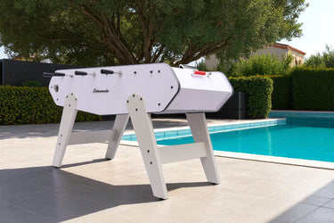 Tenté par un baby foot extérieur ? Les amateurs de baby foot pourront vivre leur passion jusque dans le jardin avec un baby foot d'extérieur conçu spécialement pour une utilisation en plein air. Vos enfants ont invité des amis à passer l'après-midi dans le jardin ? Voilà le divertissement idéal pour leur faire passer un bon moment ! Mais les adultes aussi ont leur baby foot d'extérieur attitré. De niveau intermédiaire à professionnel, nos baby foot extérieur se déclinent en de nombreuses versions pour tous les profils de joueur. Des baby foot d'extérieur qui résistent à tout ! La pluie, les UV et les insectes ne sauraient nuire à la solidité de nos baby foot d'extérieur. Leurs matériaux ultra résistants leur confèrent une grande solidité même par mauvais temps. L'extrême robustesse de leur structure, leur bois traité contre l'humidité, leur peinture résistante aux UV, leurs barres en acier haute résistance garrantie anti-corrosion et enfin leurs joueurs en matériau plastique indesctructible leur assurent une durabilité sans faille. Vous pourriez installer votre baby foot extérieur en pleine forêt pour profiter de la nature pendant vos entraînements ! Ce n'est pas parce qu'un baby foot d'extérieur possède une résistance à toutes épreuves qu'il ne faut pas en prendre soin ! Pensez simplement à les recouvrir avec leur housse de protection. En hiver il est également recommandé de les ranger à l'abri dans un endroit sec à l'abri de la lumière. En nettoyant sa visserie et sa boulonnerie avec un produit d'entretien dédié, vous préserverez ses couleurs et son imperméabilité. Les baby foot extérieur ont été pensés pour la nature et sont donc parfaitement adaptés aux établissements en plein air. Les centres aérés, campings et autres centres sportifs n'ont pas à hésiter un instant !