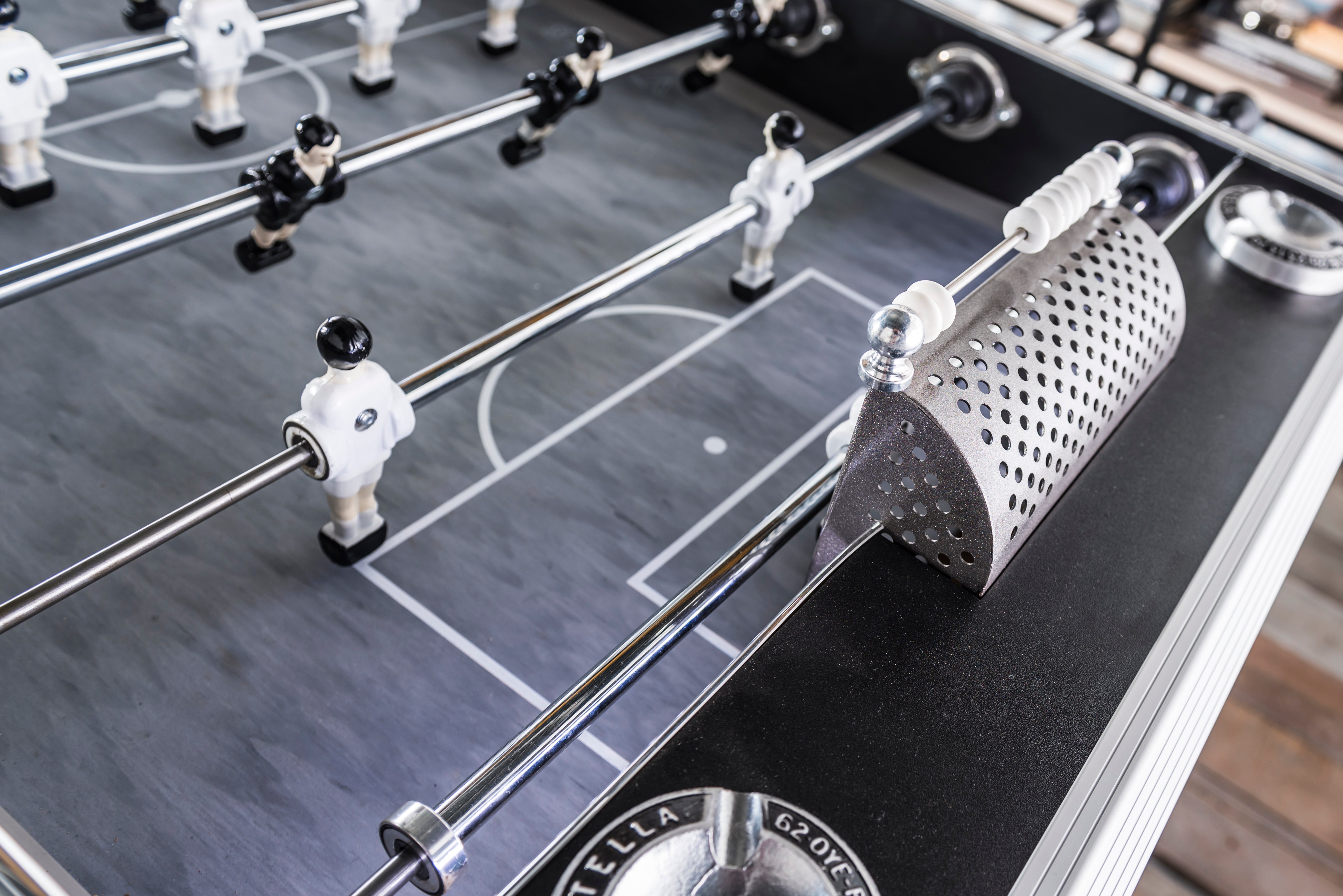 Ses pieds en bois de hêtre offrent une grande stabilité, les barres télescopiques et les poignées ergonomiques (rondes ou longues) assurent la prise en main et les joueurs en aluminium (pouvant tirer avec la tête) garantissent un contrôle absolu de la balle. Les cages de but arrondies ajoutent une touche nostalgique supplémentaire à cet étonnant baby foot.