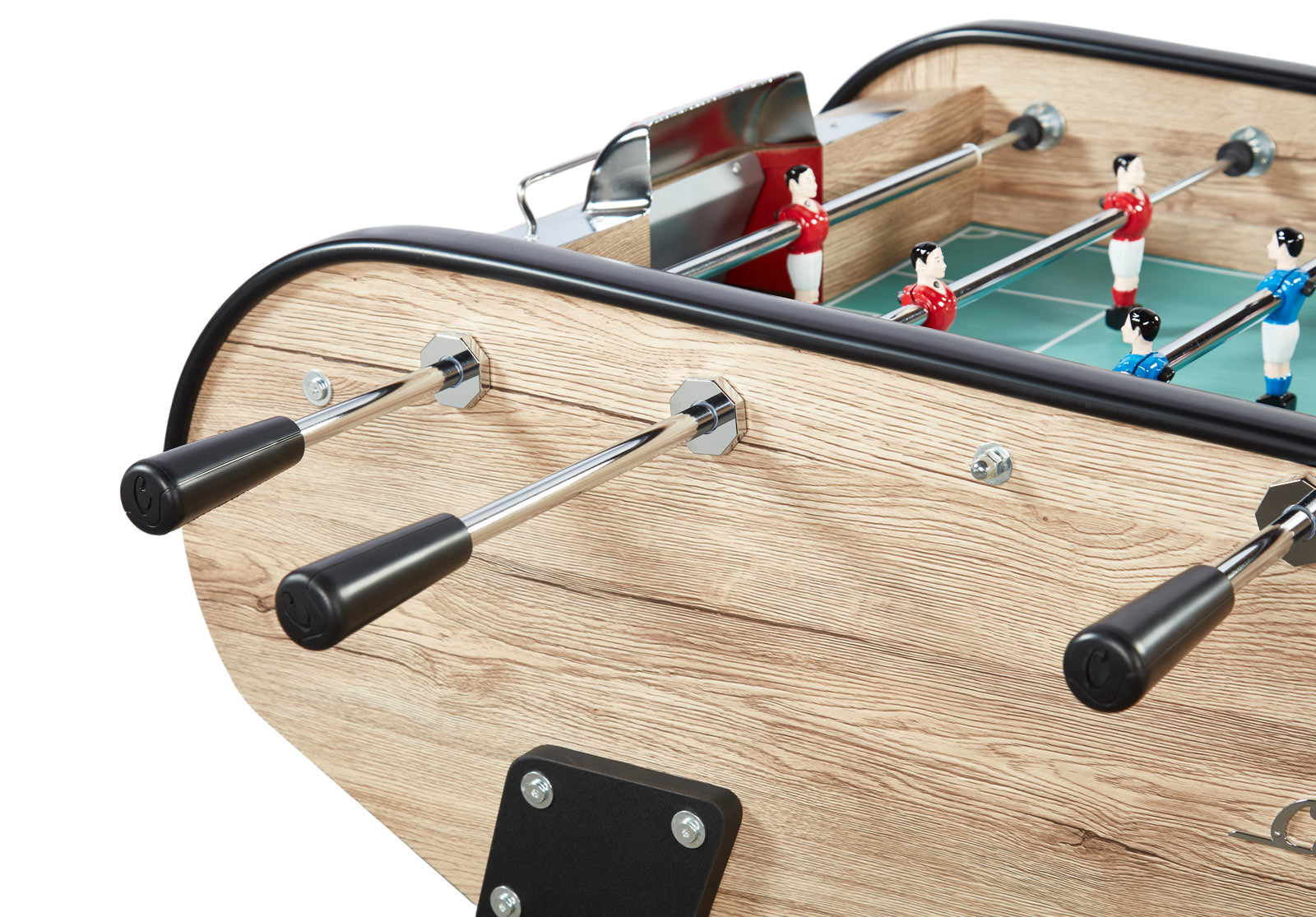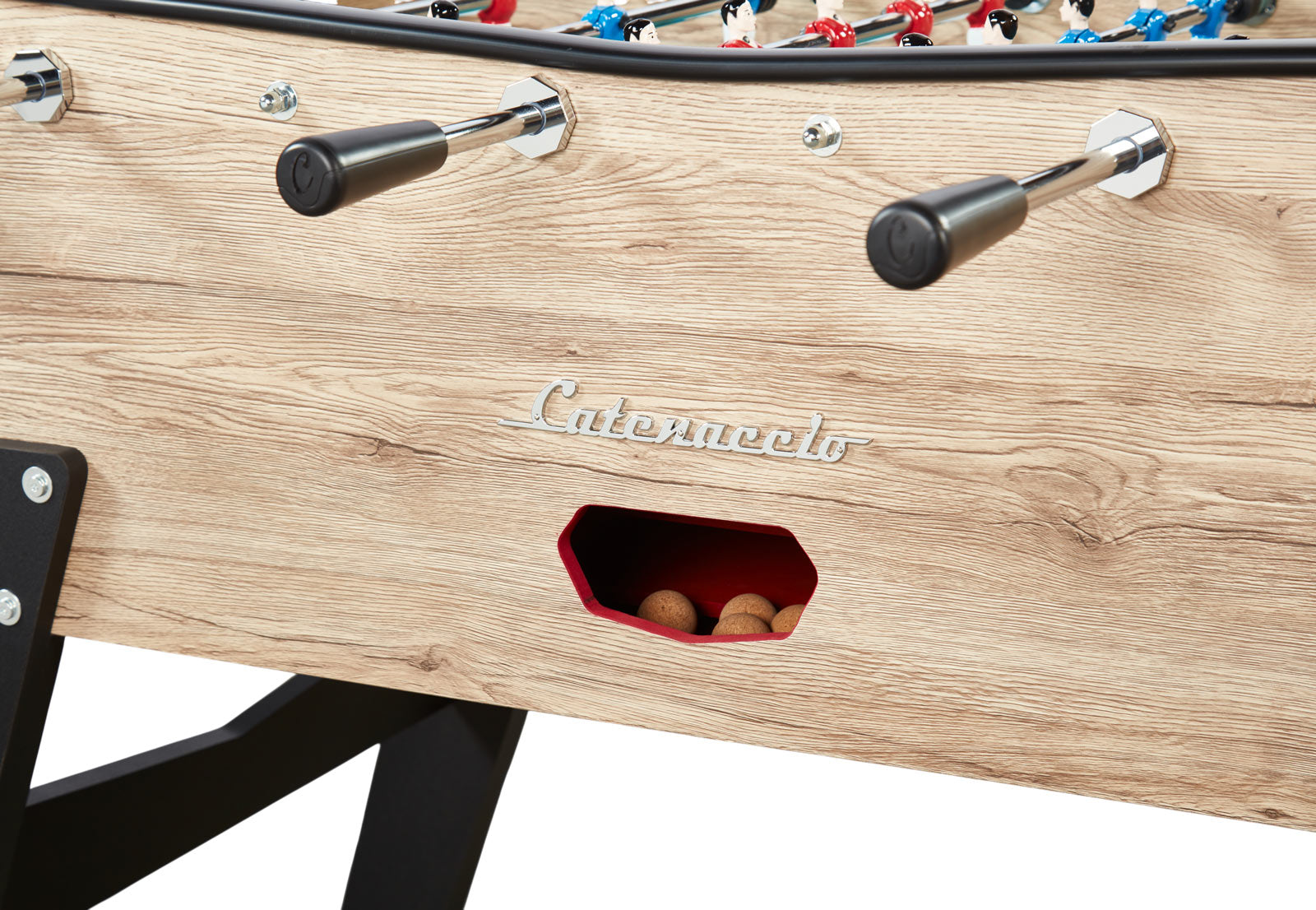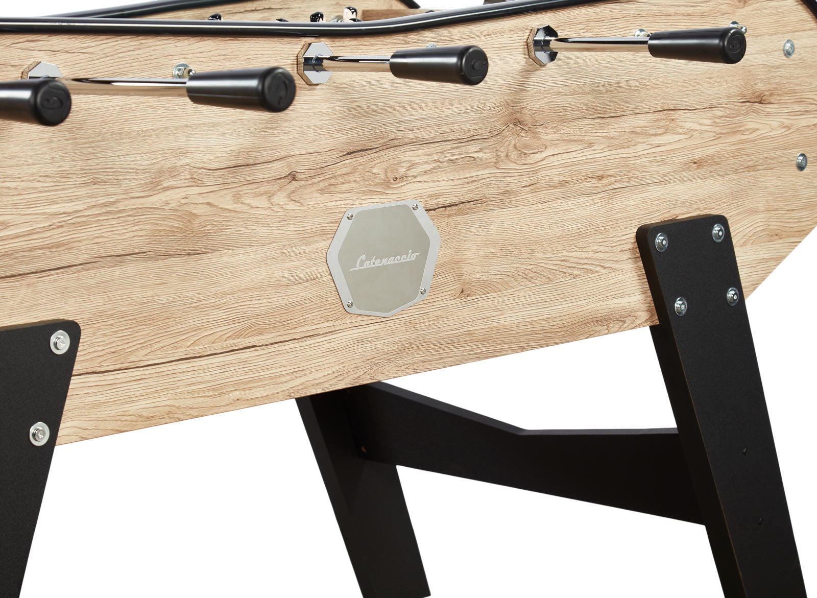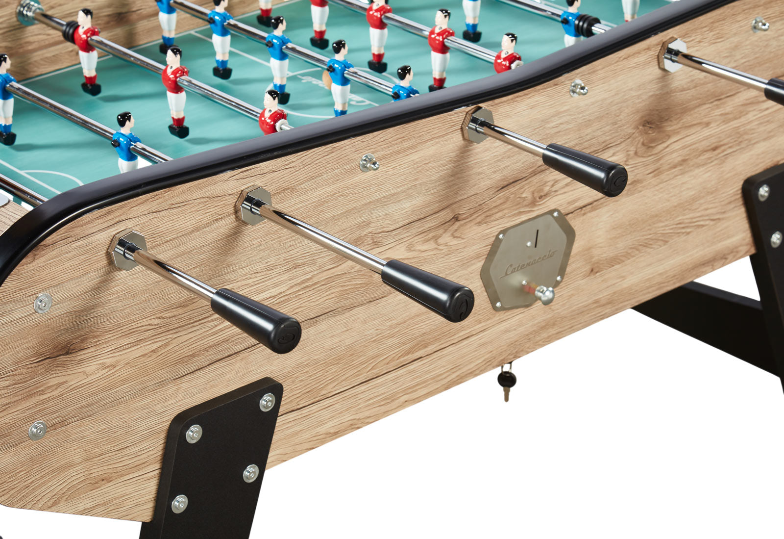 Le modèle Catenaccio Sportivo Chêne vieilli revisite le baby-foot emblématique de la marque avec une allure plus moderne et raffinée.